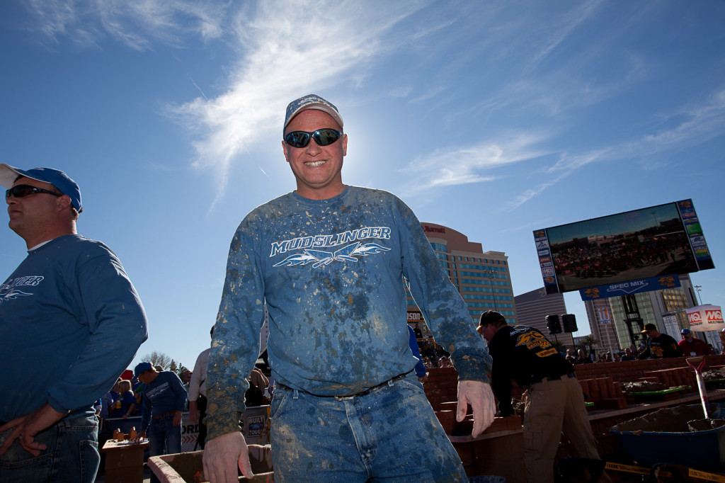 Much like a crew of roadies setting the stage for the infamous Lollapalooza rock concert, between 8 to 10 Mudslingers (a.k.a. SPEC MIX salesmen) fly into Vegas five days before the WOC/WOM kicks off to build the arena fit to showcase “MASONRY MADNESS™ Day”—the masonry industry’s one-day gig that includes four separate competitions. In chronological order, the battles are: MCAA MASONRY SKILLS CHALLENGE, SPEC MIX TOUGHEST TENDER, MCAA FASTEST TROWEL ON THE BLOCK, and the headliner SPEC MIX BRICKLAYER 500.
