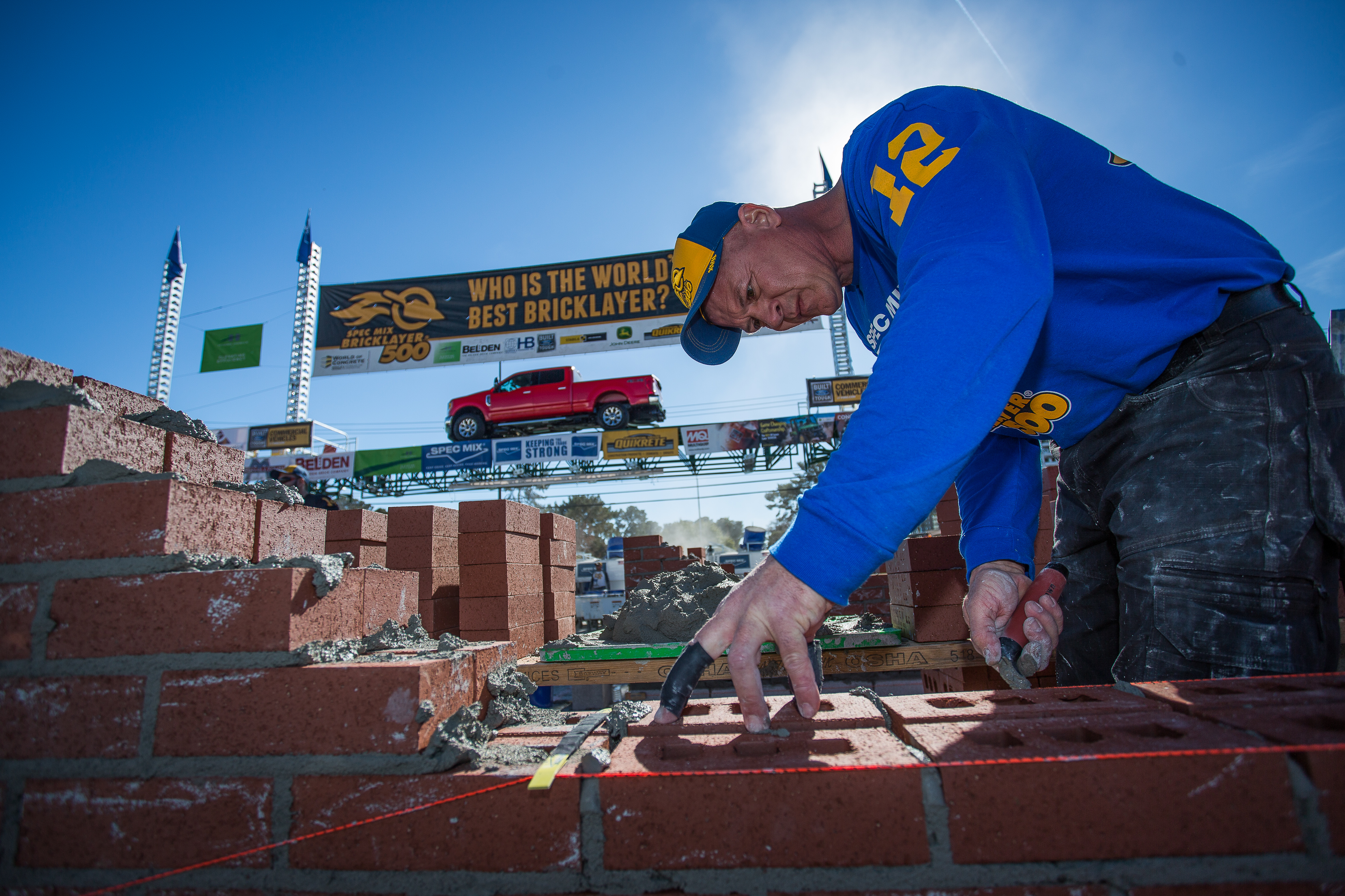 2019 SPEC MIX TOP CRAFTSMAN winner, Darian Douthit, Providence Masonry, Fairland, OK, building the wall that secured him a John Deere Gator Crossover Utility Vehicle.