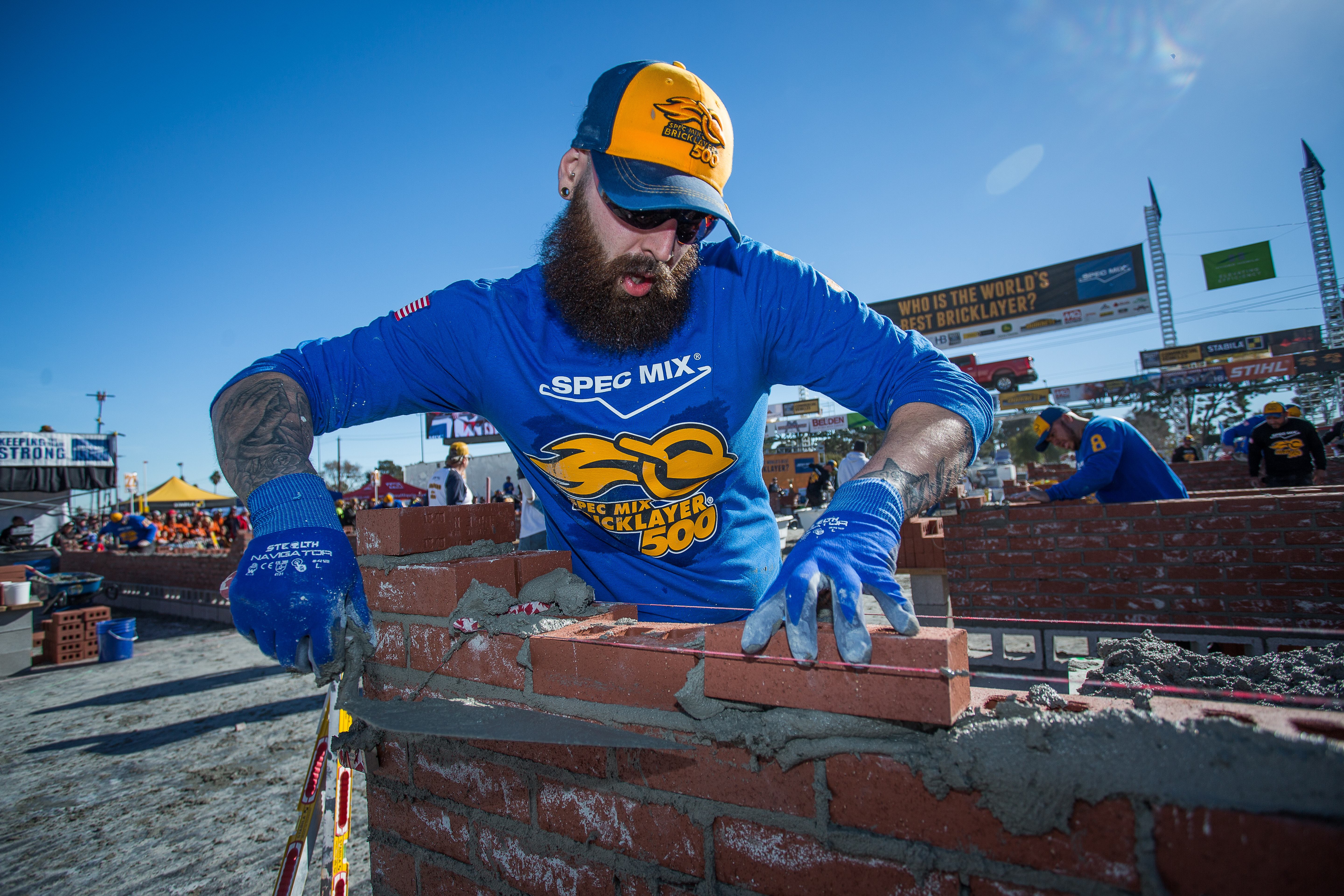 2019 SPEC MIX BRICKLAYER 500® World Champion mason Mario Alves working on his competition winning wall.