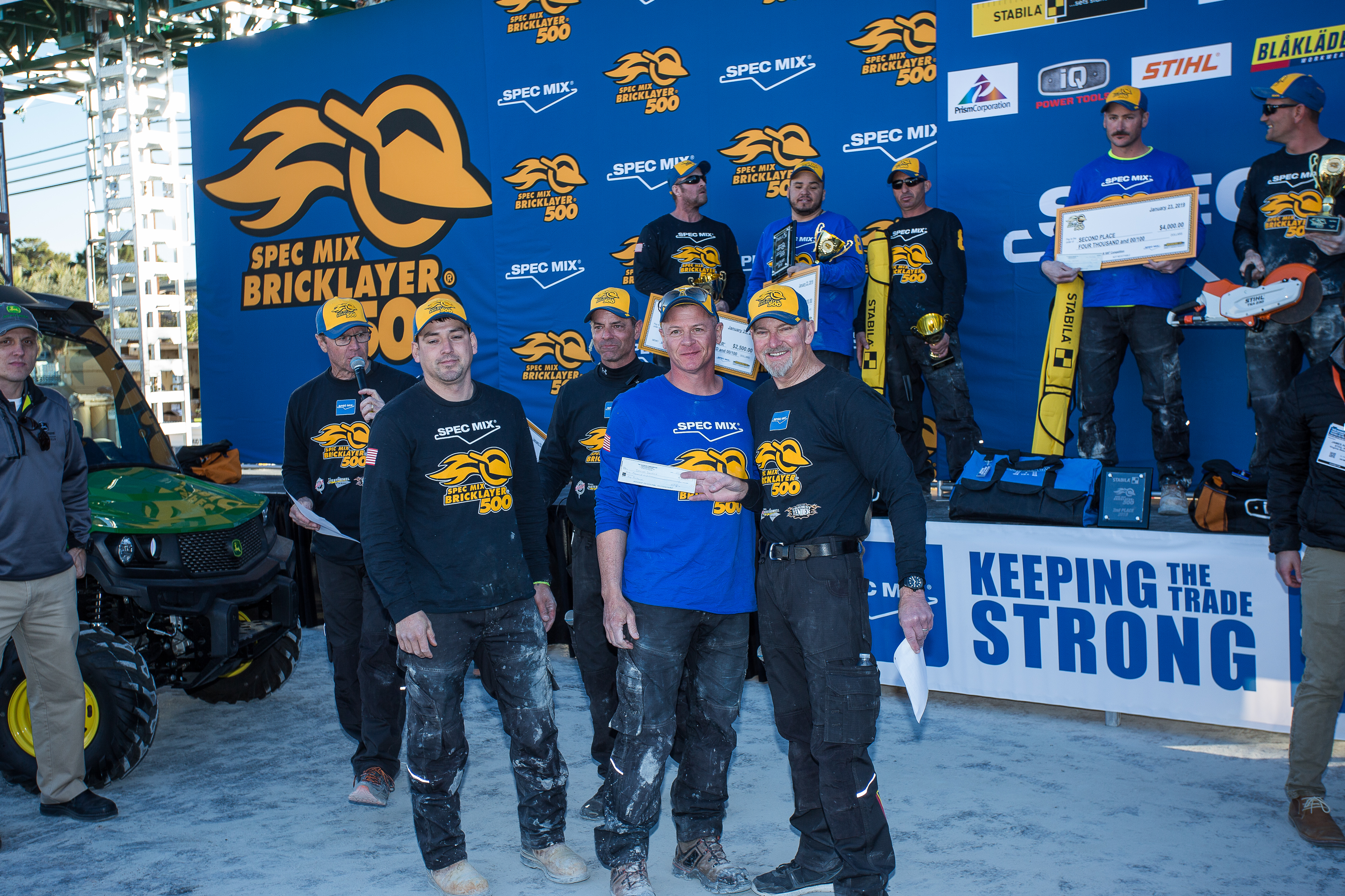 2019 SPEC MIX TOP CRAFTSMAN® winning mason, Darian Douthit, Providence Masonry, Fairland, OK and his mason tender, Andy Zepeda, posing with SPEC MIX VP Brian Carney.