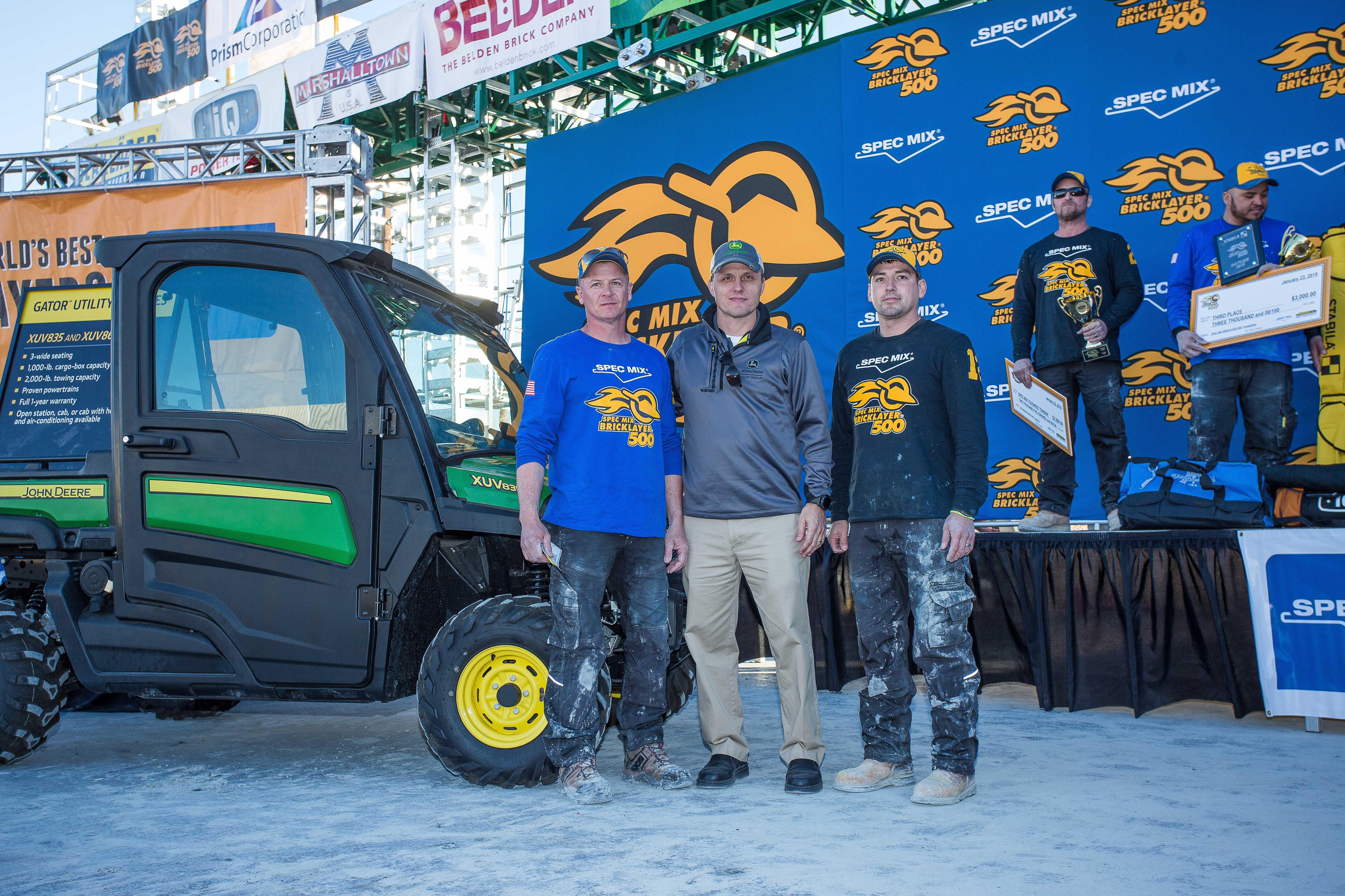 2019 SPEC MIX TOP CRAFTSMAN® winning mason Darian Douthit, and his mason tender, Andy Zepeda, posing with a representative from John Deere.