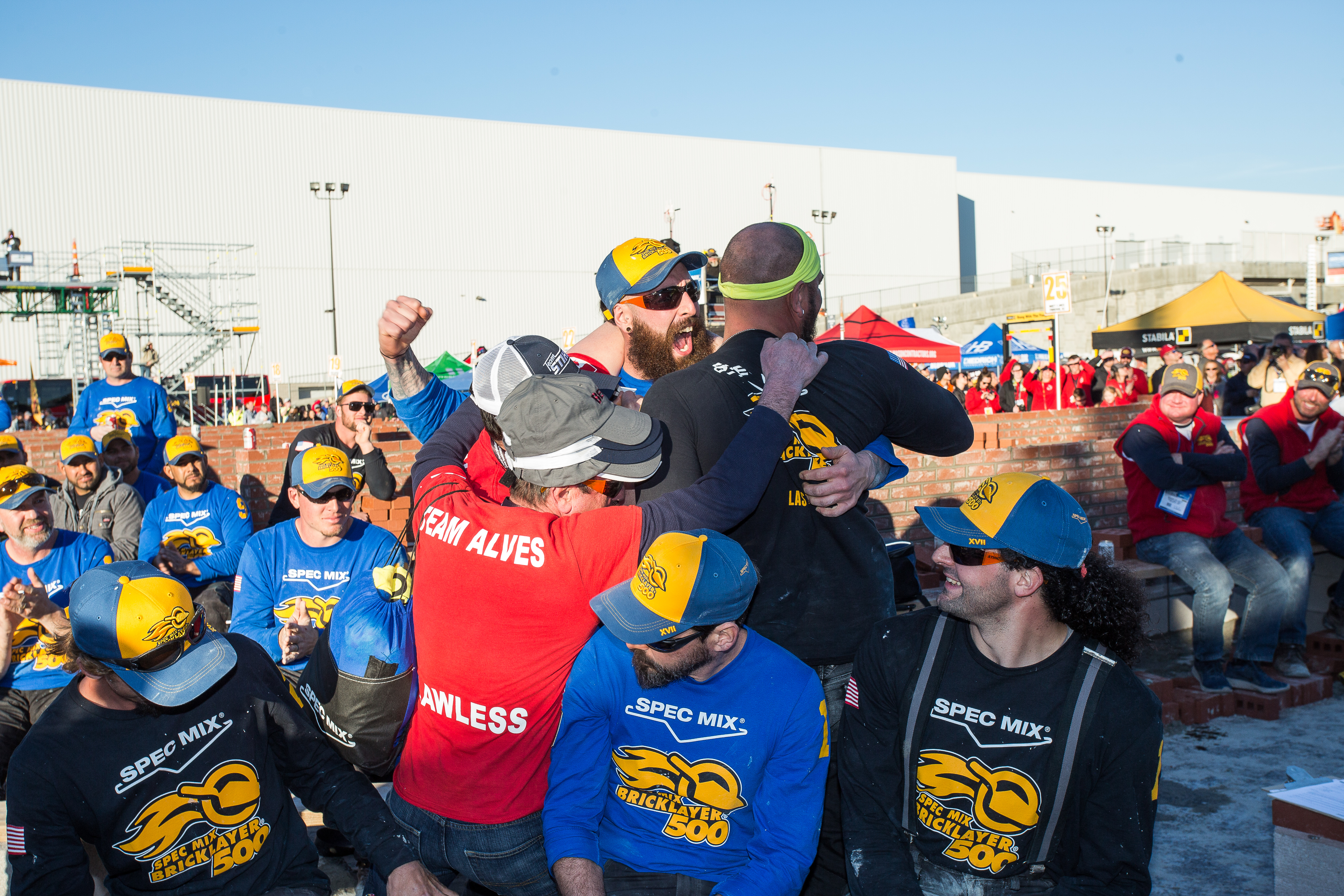 Hamilton, Ontario mason Mario Alves and mason tender, Michael Alves celebrate winning the 2019 SPEC MIX BRICKLAYER 500® World Championship.