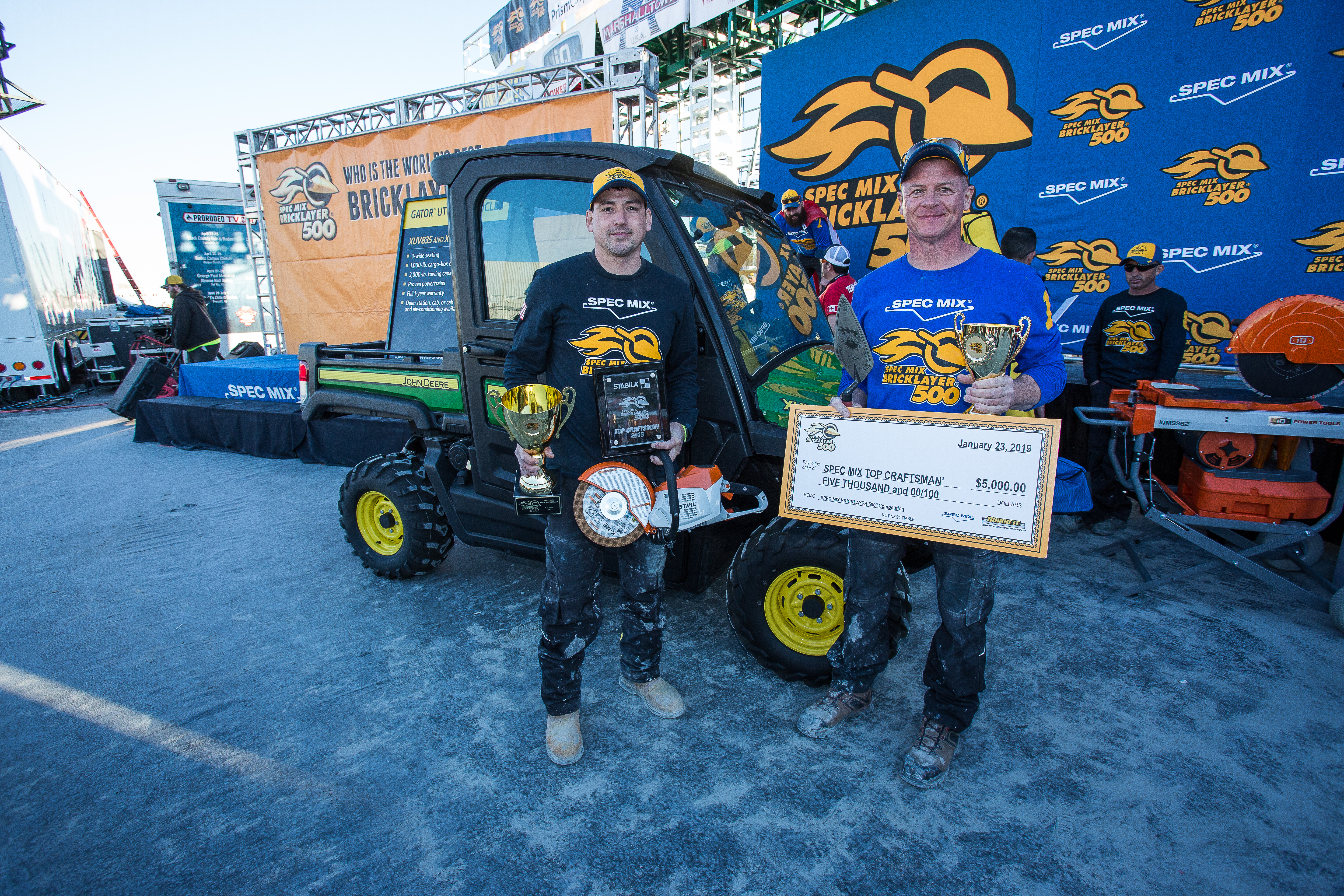 2019 SPEC MIX TOP CRAFTSMAN® winning mason Darian Douthit and his mason tender Andy Zepeda, Providence Masonry, Fairland, OK pose with the John Deere Gator XUV they won by building the "most sell-able wall."