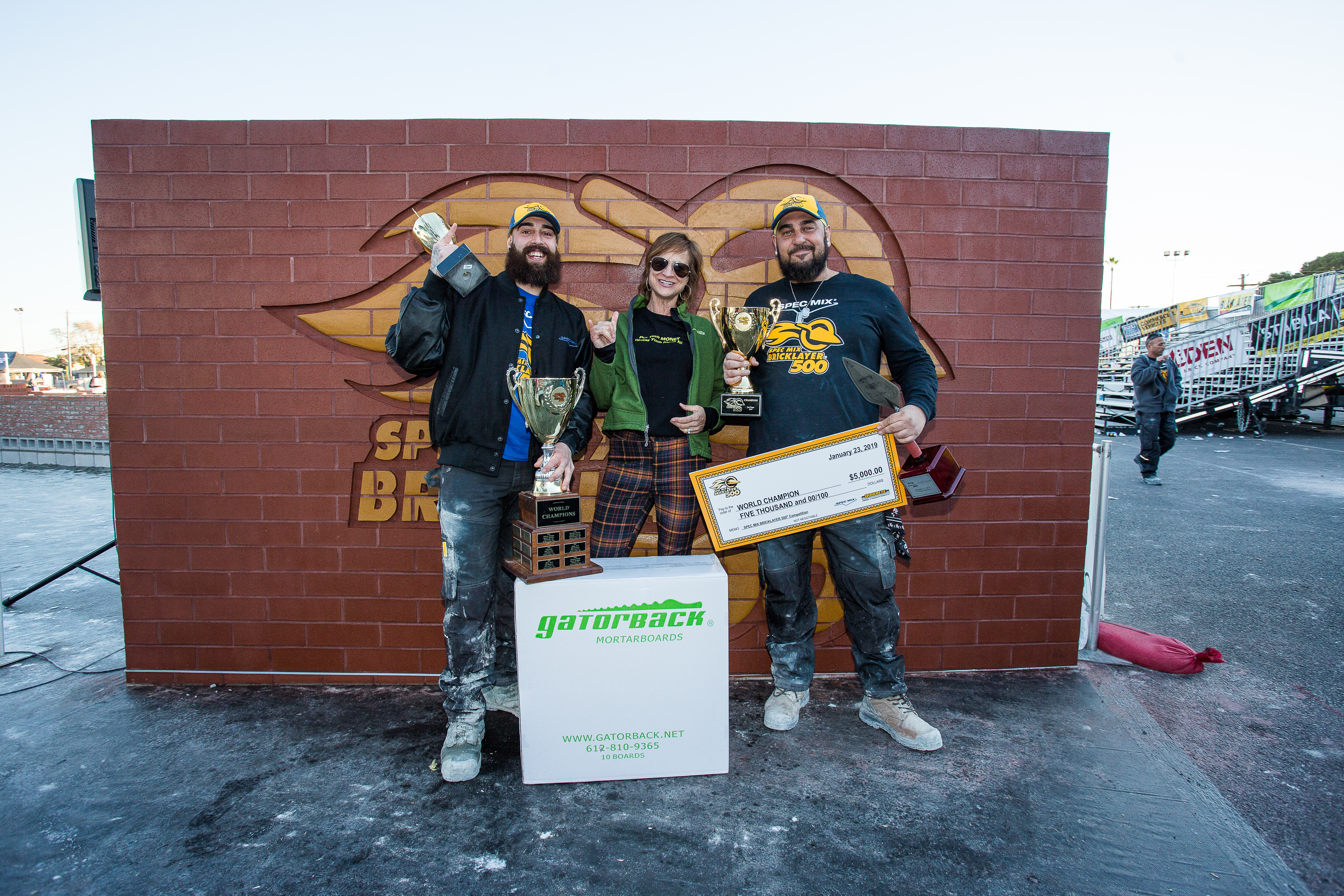 2019 SPEC MIX BRICKLAYER 500® winning mason Mario Alves and his mason tender Michael Alves, A&M Masonry, Hamilton, ON, pose with Shelly Carney from Gatorback Mortarboards in front of the SMBL500 wall donated by Belden Brick and IMI.